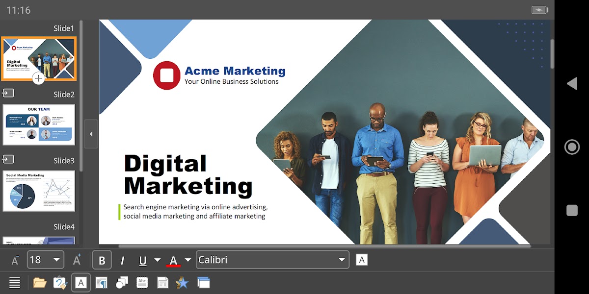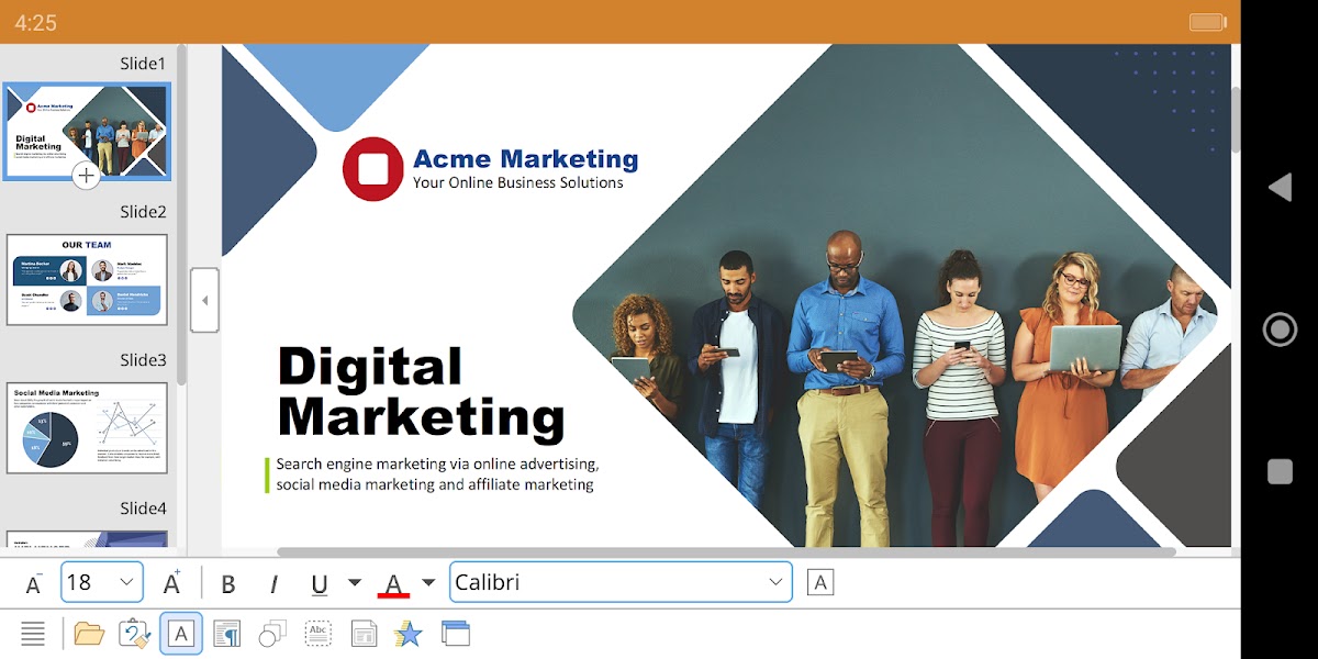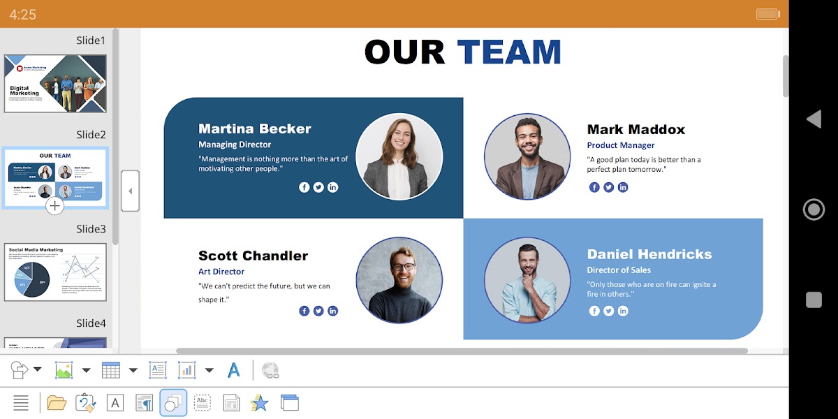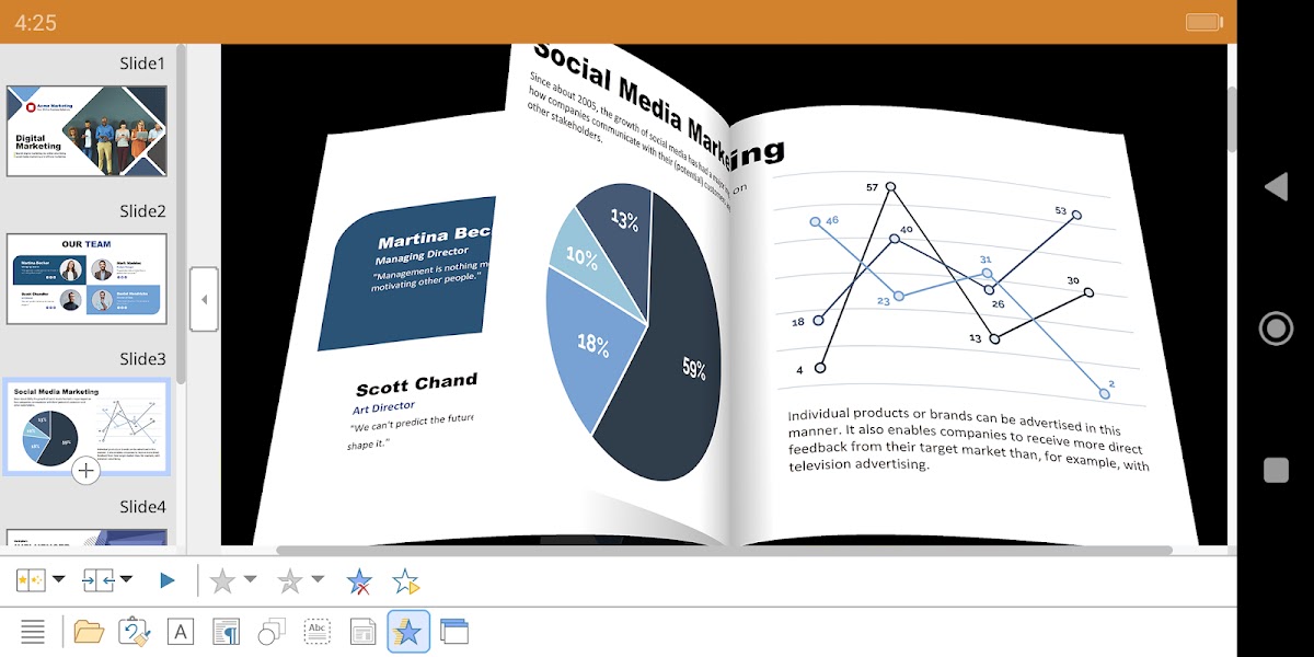 Presentations переносит возможности программы для работы с презентациями для ПК на ваше устройство Android. Не соглашайтесь на меньшее.