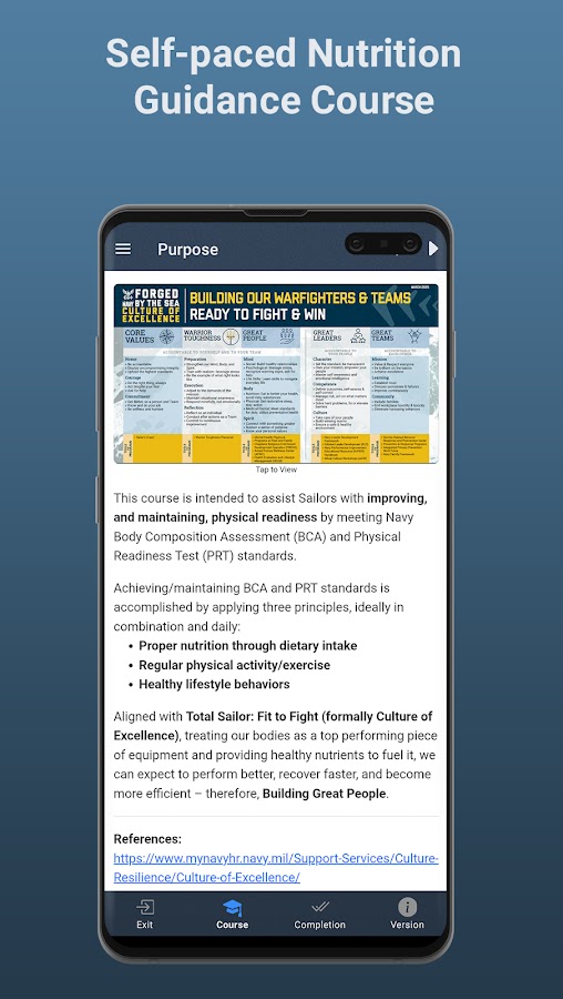 Официальное приложение ВМС США для оценки физической подготовки (PFA) предоставляет морякам всю необходимую информацию о программе физической готовности для поддержания оптимального здоровья, физической формы и боеготовности в соответствии со стандартами ВМС. Приложение предлагает актуальные рекомендации по всем аспектам программы физической готовности ВМС, включая информацию о правильном питании, здоровье, физической подготовке, аэробной выносливости, мышечной силе, мышечной выносливости, составе жировой ткани, а также о новых методах выполнения упражнений «планка» и «гребля».