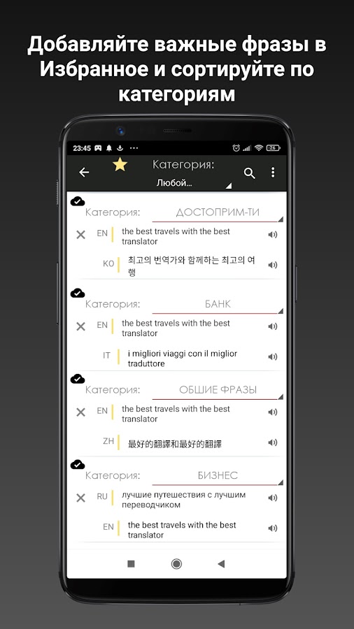 ► Возможность сортировать и фильтровать фразы в Избранном по категориям и языковым парам