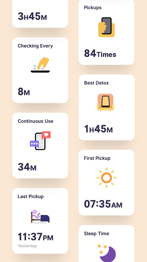 • Просматривайте действия экранного времени: получение, проверка каждого, ходьба, неподвижный образ жизни, последний сбор, первый сбор, лучшее время перерыва и сна.