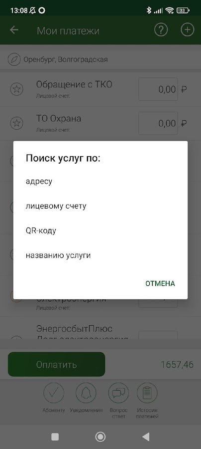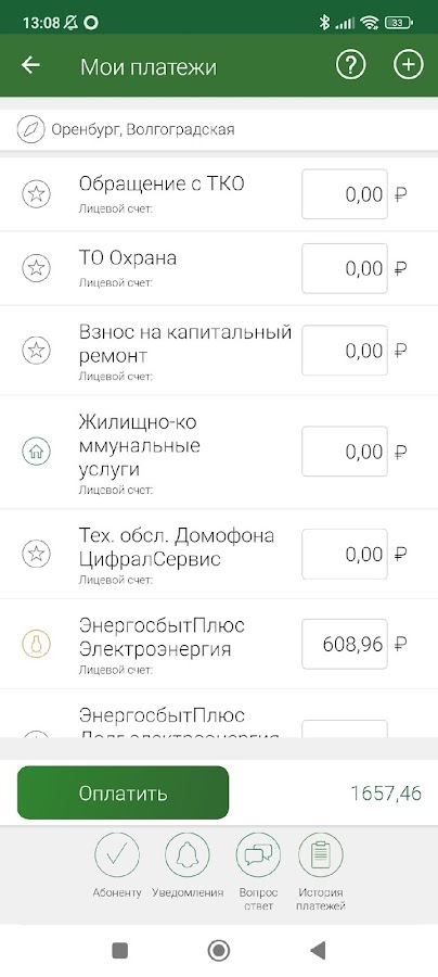 В меню «Уведомления» отражены сообщения о выставлении счетов, квитанции на оплату, новых поставщиках услуг, работе сервисов, оплатах, регистрации и ходе рассмотрения заявок, код подтверждения операций из PUSH-уведомлений.