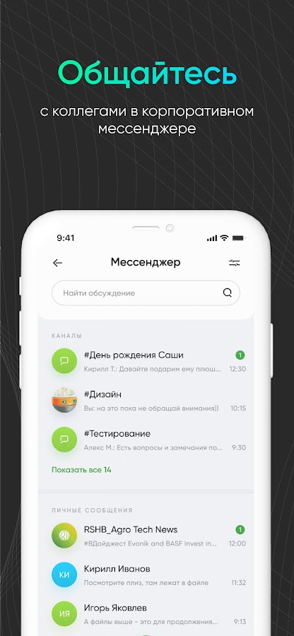 — общайтесь с коллегами в защищённом мессенджере;