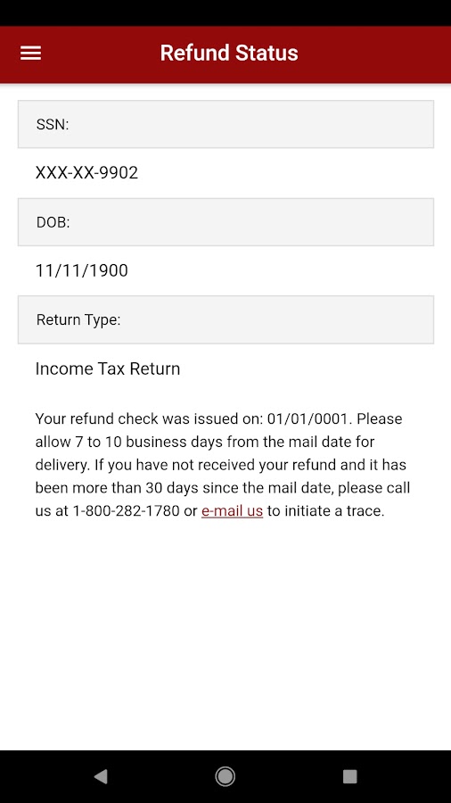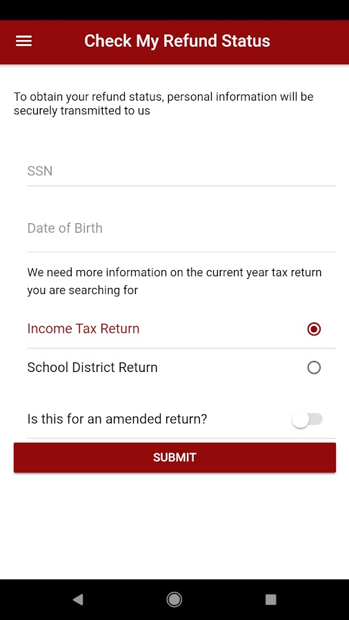 Это приложение позволяет только проверить статус возврата, поданный в текущем году за предыдущий налоговый год. Вы должны ввести личные данные и определить тип налога и тип возвращаемого вы вопросительно о. Особенности включают в себя: