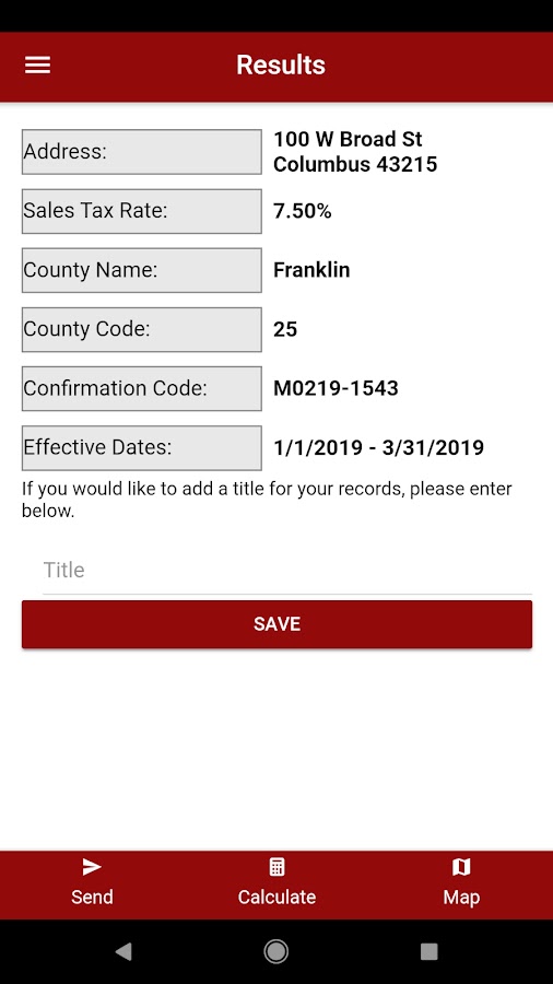 • Возможность ввести адрес, почтовый индекс или ваше текущее местоположение (с помощью GPS) для расчета суммы налога с продаж, чтобы собрать или заплатить.