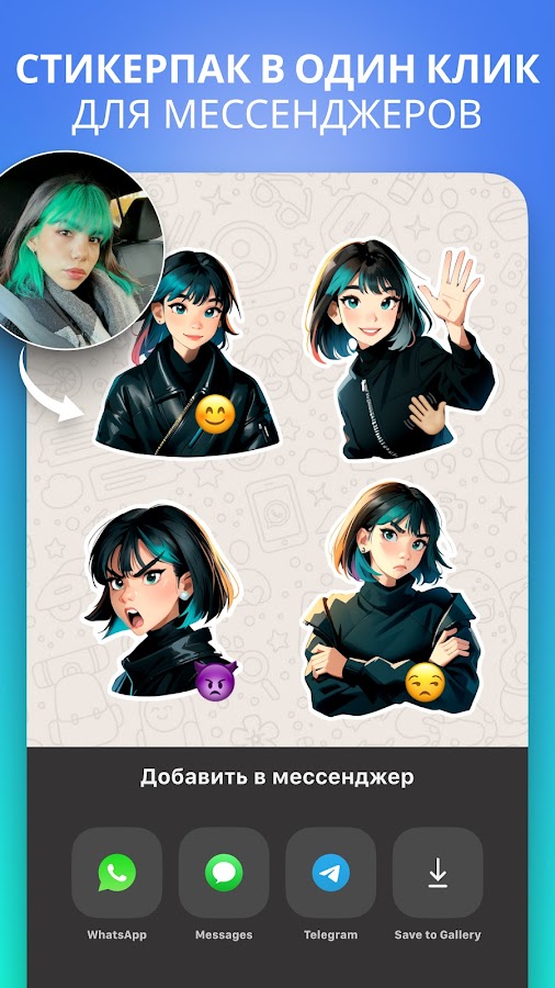 ► Создавайте и делитесь наборами стикеров для любых мессенджеров: Превратите свои фотографии в забавные, выразительные мультяшные стикеры в различных стилях. Создавайте персонализированные наборы стикеров, чтобы быстро добавить уникальности в ваши беседы во всех мессенджерах, и самое главное – экспортировать их очень просто!