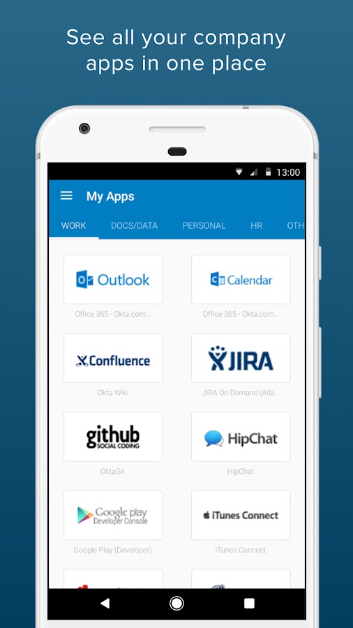 Okta Mobile обеспечивает единый вход в приложения на вашем Android-устройстве. Будучи сопутствующим приложением к службе управления идентификацией Okta, Okta Mobile позволяет вам просто войти в систему с учетными данными Okta и получить немедленный доступ ко всем приложениям вашей компании.