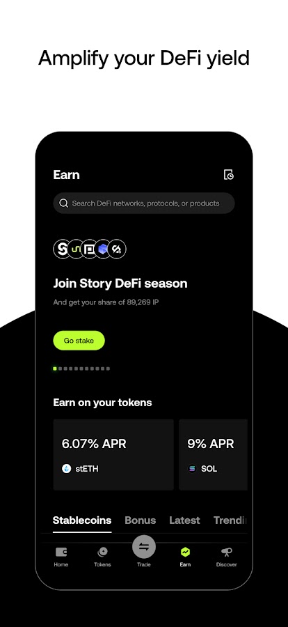 ● Стейкинг криптовалют, таких как ETH, SOL, USDT и USDC, для получения пассивного дохода