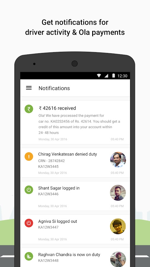 — Получение уведомлений о важных событиях, таких как платежи от Олы, и водитель Логин / выход из системы