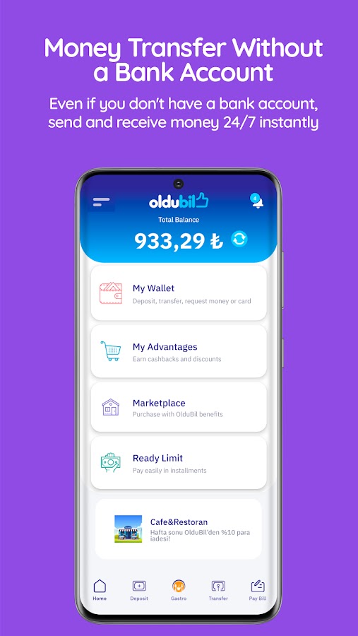 С OlduBil вам не нужен банковский счет для отправки и получения денег 24/7. Введя в приложение номер карты или телефона пользователя OlduBil, которому вы хотите отправить деньги, вы можете отправить деньги 24/7 и воспользоваться преимуществами быстрого и бесплатного перевода денег.