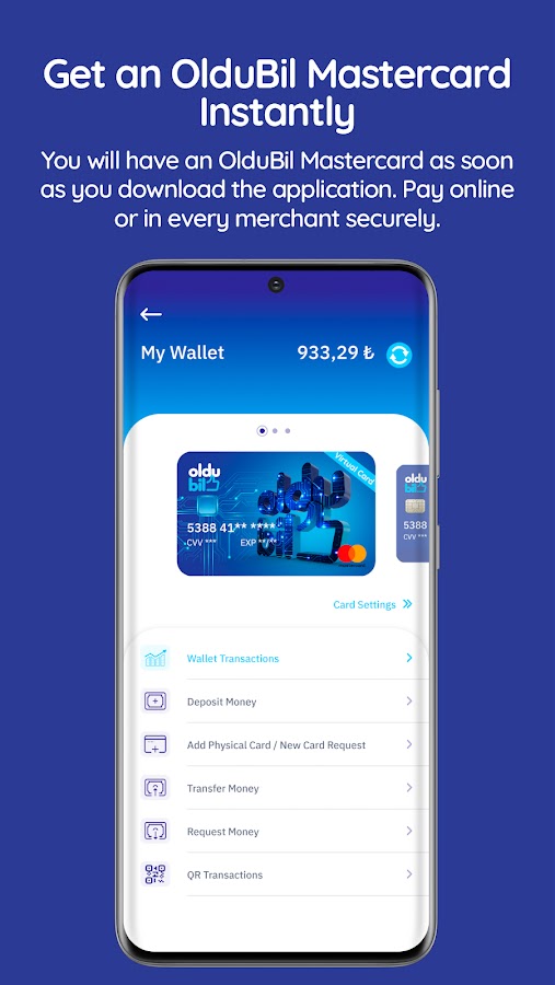 С вашей лицензированной виртуальной картой предоплаты Mastercard вы можете легко и безопасно совершать покупки в Интернете и на любом рабочем месте. Вы можете использовать свою карту OlduBil в любой точке мира, где действует Mastercard. Если вы хотите, вы можете запросить физическую карту из приложения или получить карту в точках продаж, работающих по контракту.