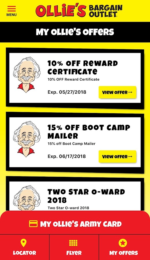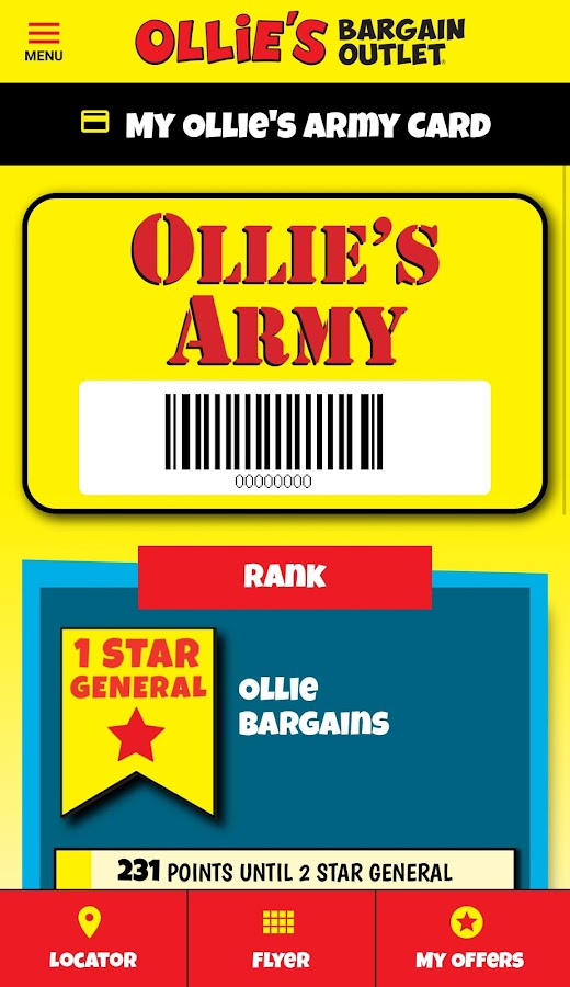 • Вашего Олли армия карта и спецпредложения все здесь, только и ждет, чтобы быть отсканировано прямо с вашего телефона! Вы даже можете просмотреть ранг и очки или обновить информацию о профиле!
