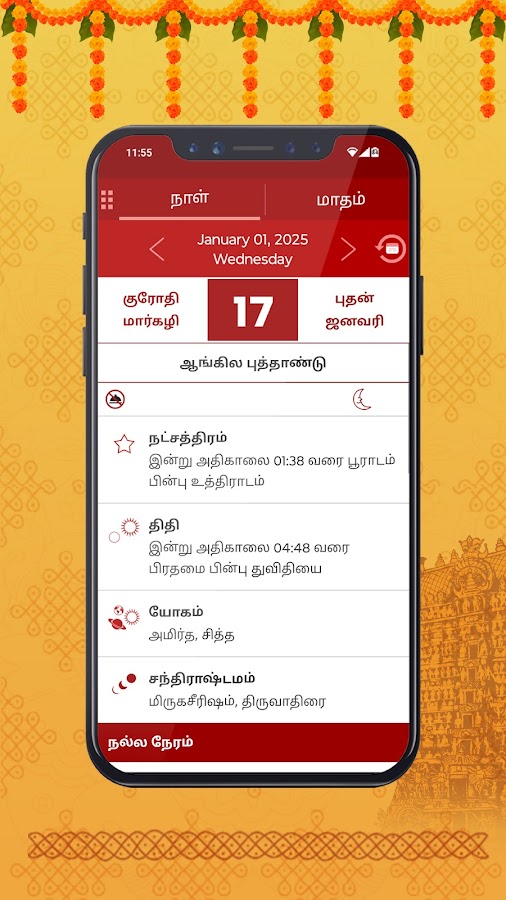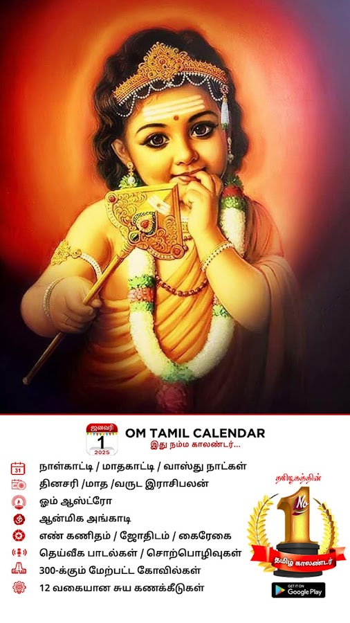 * Благоприятные дни: события Амавасай, Пурнами, Прадошам, Картигай, Экадаши, Чатуртхи, Шиваратри, Сашти, Тирувонам, Анмигам и другие автоматически уведомляются на тамильском и английском языках.