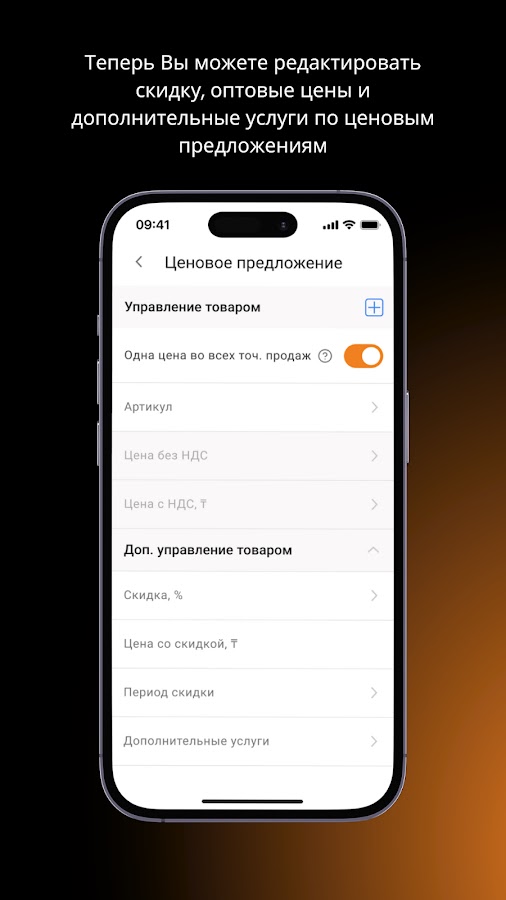 • Редактировать цены, скидки, оптовые цены и дополнительные услуги по ценовым предложениям