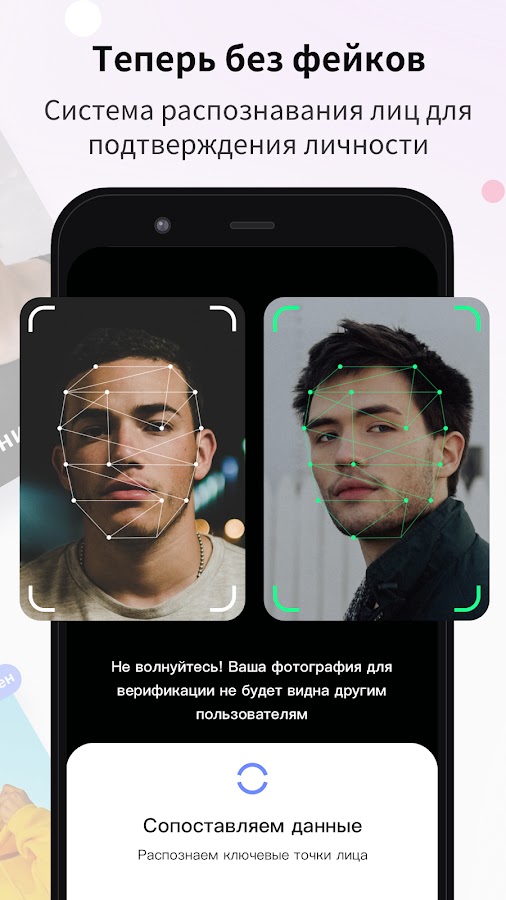 -Наше сообщество за честное общение! В Оми мы используем самую точную систему распознавания лиц для верификации фотографии профиля менее чем за 15 секунд! Только пользователи, которые прошли верификацию, могут продолжать знакомиться и создавать пары в Оми. Мы делаем всё, чтобы в Оми вы знакомились только с настоящими людьми