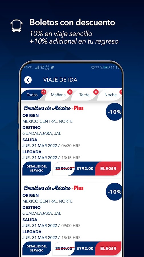 Официальное приложение Omnibus de México путешествуйте комфортно и безопасно, покупая билеты на автобус в 3 простых шага и получая скидку 10% на поездку в один конец плюс 10% на обратную поездку при покупке туда и обратно, платите в течение 3 или 6 месяцев без процентов с карточки участников.