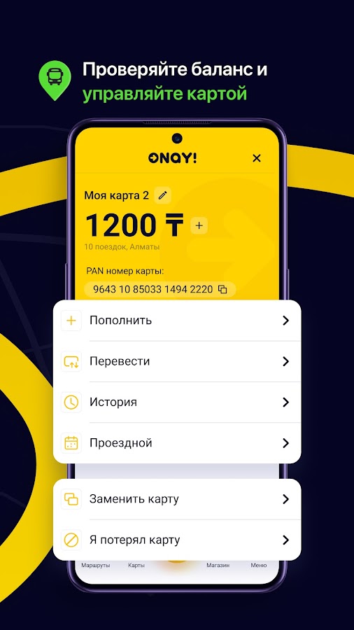 • легко и быстро пополняйте баланс карты ONAY!;