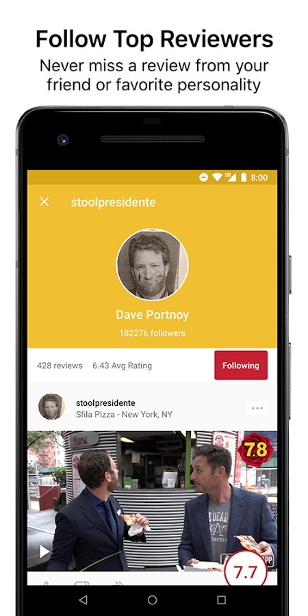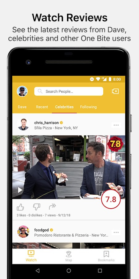 — Загрузите свой собственный видео-обзор с оценкой One Bite в любом пиццерии, оценивая его от 0 до 10. (Десятичные оценки поддерживаются, поэтому любительских отзывов нет)
