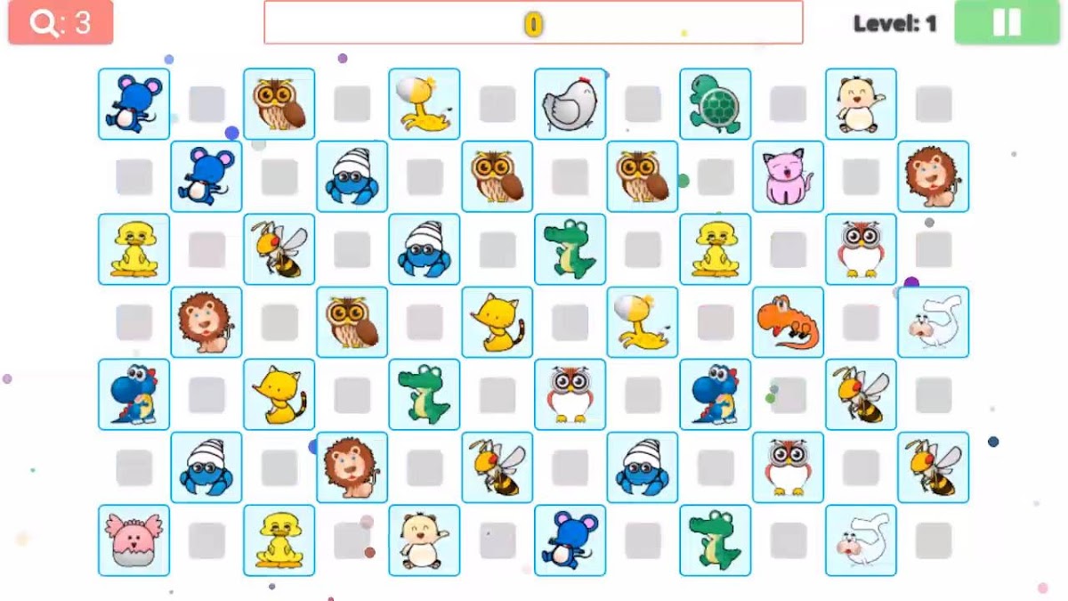 ✓ Вам нужно найти две одинаковые плитки-иконки, которые можно соединить с помощью до 3 прямых линий, где нет других плиток, блокирующих путь соединительной линии.