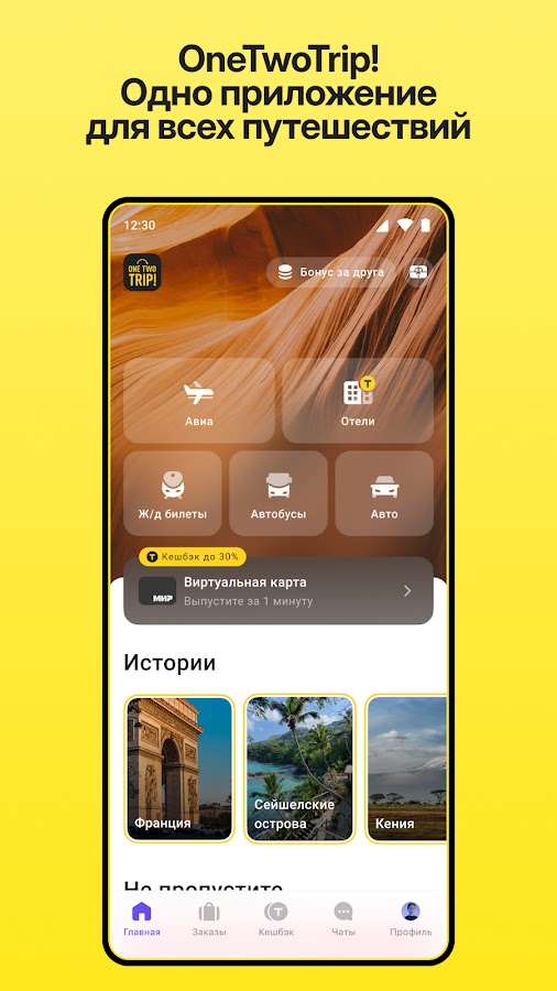 В приложении OneTwoTrip есть всё для путешествия: авиабилеты от 800 авиакомпаний, 3 000 000 отелей и гостиниц, ЖД билеты на поезда РЖД, аренда авто, экскурсии.