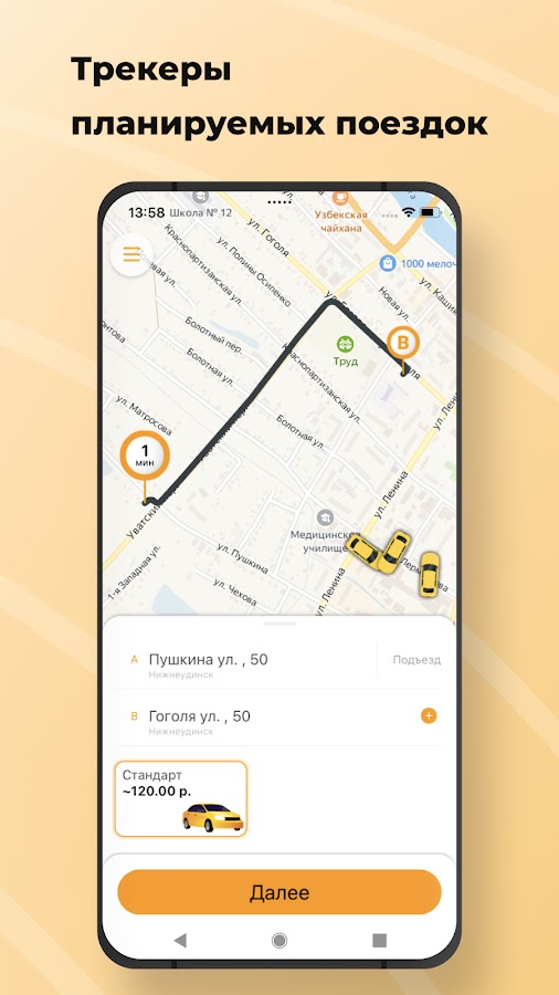 Выберите опцию “Предварительный заказ”. Поиск автомобиля начнется незадолго до заказа поездки, и автомобиль приедет к назначенному времени. Также вы будете заранее знать стоимость поездки.