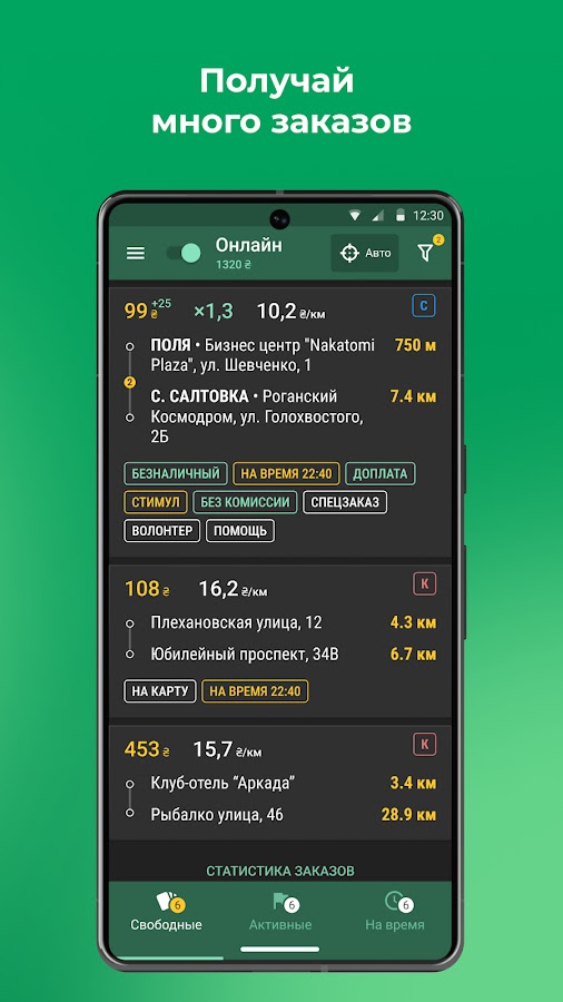 — Фильтрация заказов в эфире по радиусу, длине маршрута и тарифу;