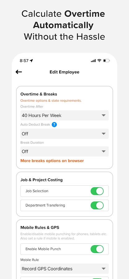 • Автоматические расчеты заработной платы. Позвольте OnTheClock выполнять расчеты заработной платы, вычеты и соблюдение налогового законодательства, чтобы сотрудники получали зарплату точно и вовремя.