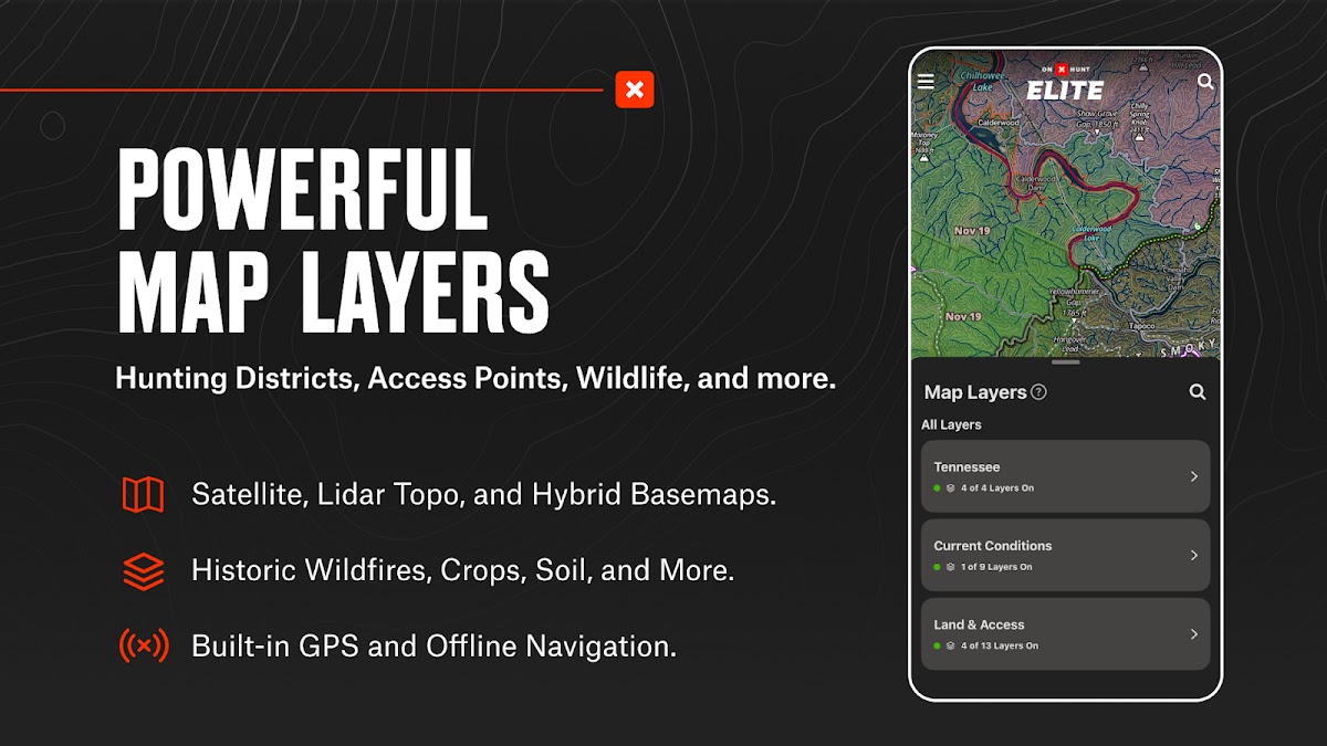 Охотьтесь эффективнее с помощью инструментов анализа местности и разведывайте любую лицензию с помощью слоев карт, специфичных для штата. Изучайте условия, точки доступа, диких животных, деревья, почву и многое другое. Добавляйте пометки, устанавливайте оптимальные ветровые условия для любой путевой точки и сотрудничайте, делясь охотничьими угодьями и следами.
