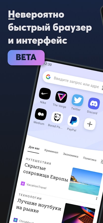 Загрузите бета-версию Opera для Android прямо сейчас и попробуйте в действии новейшие функции, которые мы разработали специально для нашего самого мощного браузера. Примите участие в процессе разработки: ваше мнение поможет нам создать самый лучший браузер для топовых мобильных устройств.