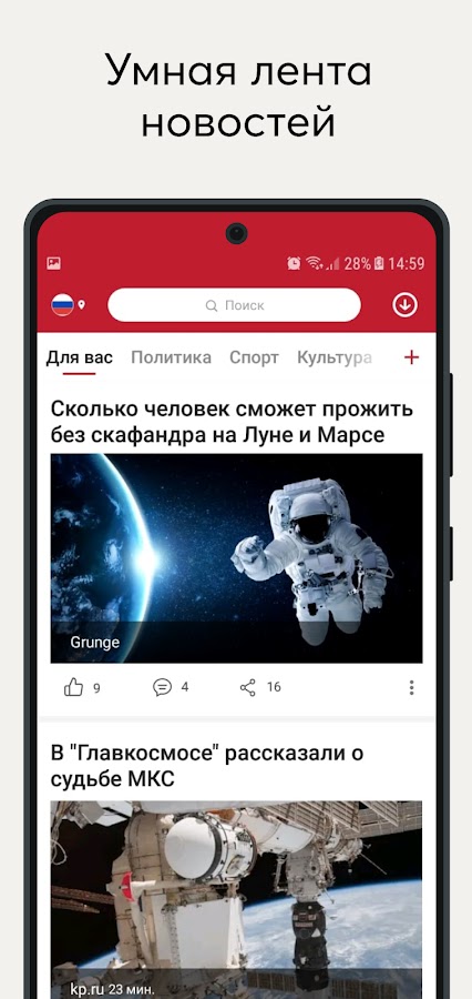 Opera News предоставляет самую актуальную информацию о том, что происходит в стране и в мире. Помимо основной ленты новостей, также доступны специальные новостные каналы о политике, экономике, шоубизнесе, технологиях, науке, спорте, образовании.