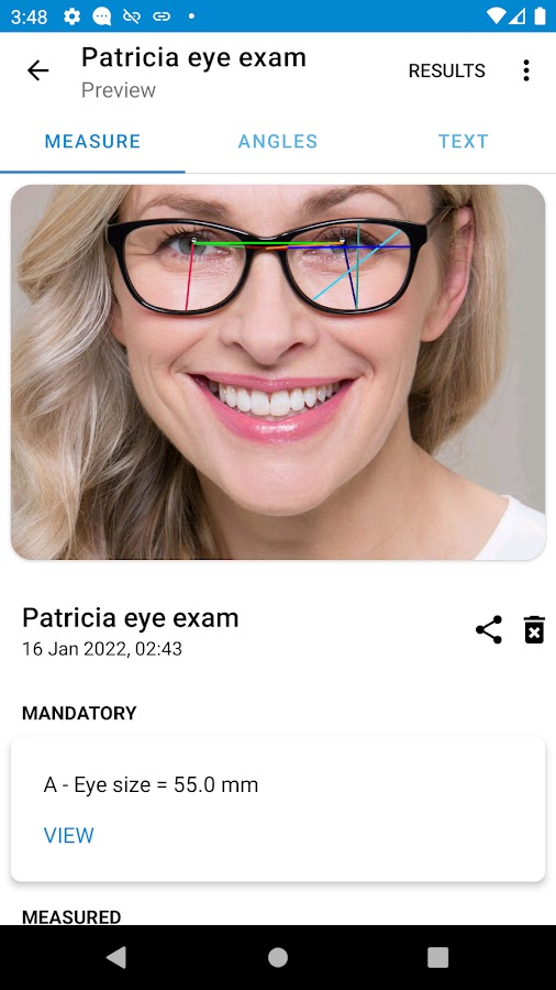 Измеряйте всё необходимое для заказа очков — МЗР, высоту центрирования, параметры прогрессивных линз и многое другое — прямо по фотографии пациента в оправе. ИИ-распознавание лица автоматически расставляет измерительные точки, и вы получаете точные результаты за секунды, а не минуты.