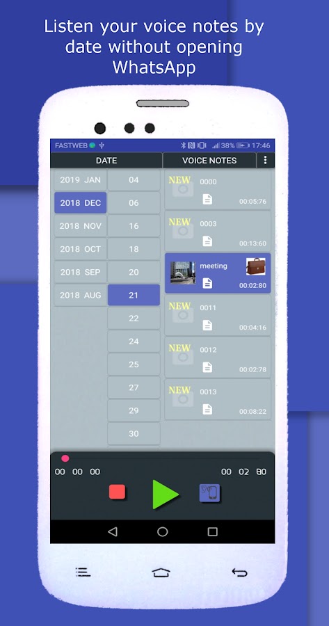 -WHATSAPP VOICE NOTES HISTORY: Opus Player берет историю всех ваших голосовых сообщений, полученных и отправленных, и показывает их вам в порядке даты, давая вам возможность легко найти старую голосовую заметку и поделиться ею с другими приложениями.