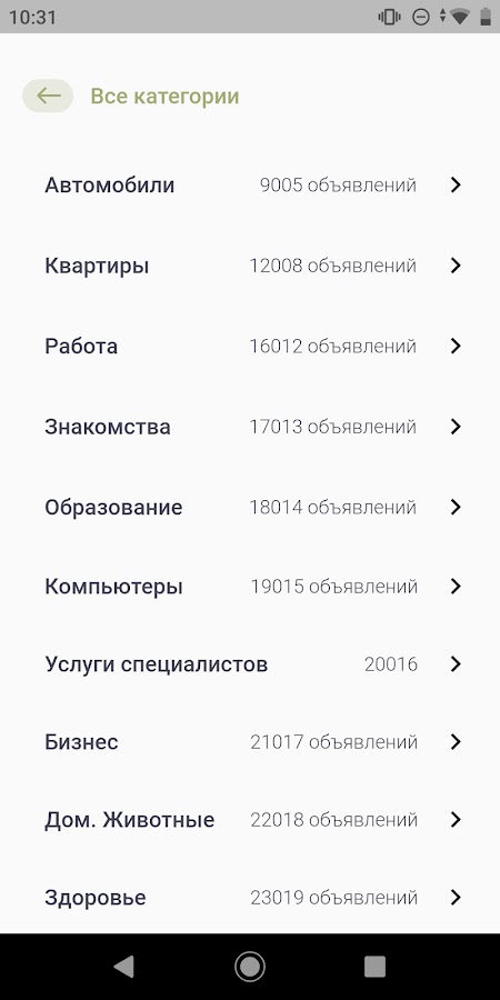 Каталог объявлений включает следующие разделы: Недвижимость; Работа; Автомобили; Услуги специалистов; Образование; Домашние животные; Бизнес; Дети; Перевозки; Отдых; Работа; Разное.