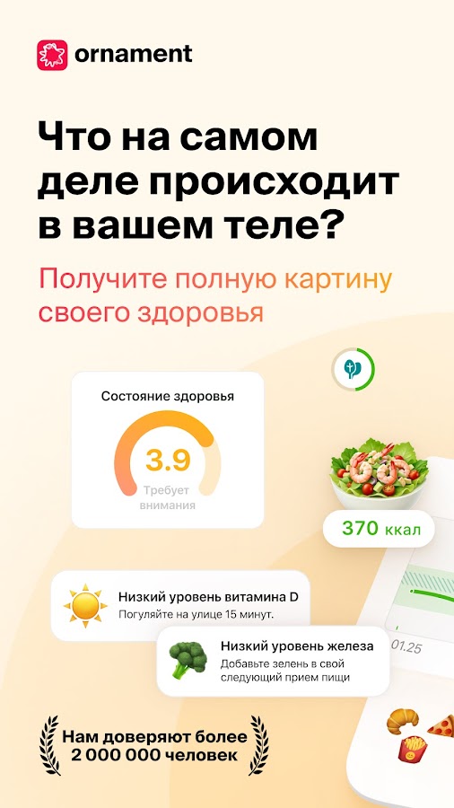 Орнамент создаст индивидуальный план улучшения здоровья или снижения веса на основе ваших анализов и целей. Следите за прогрессом, выполняйте ежедневные задания — никаких экстремальных диет и ограничений.