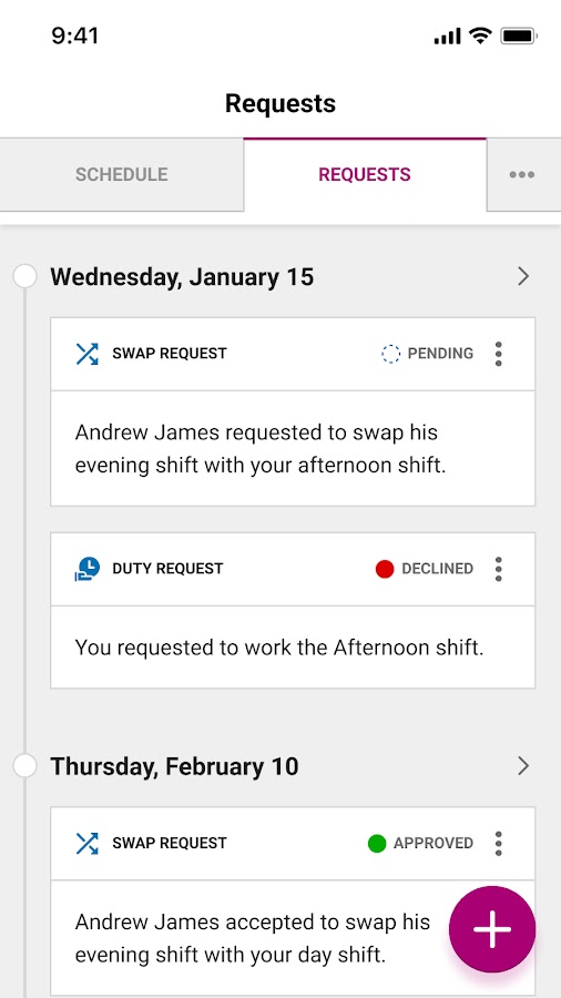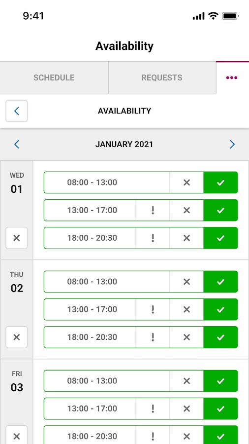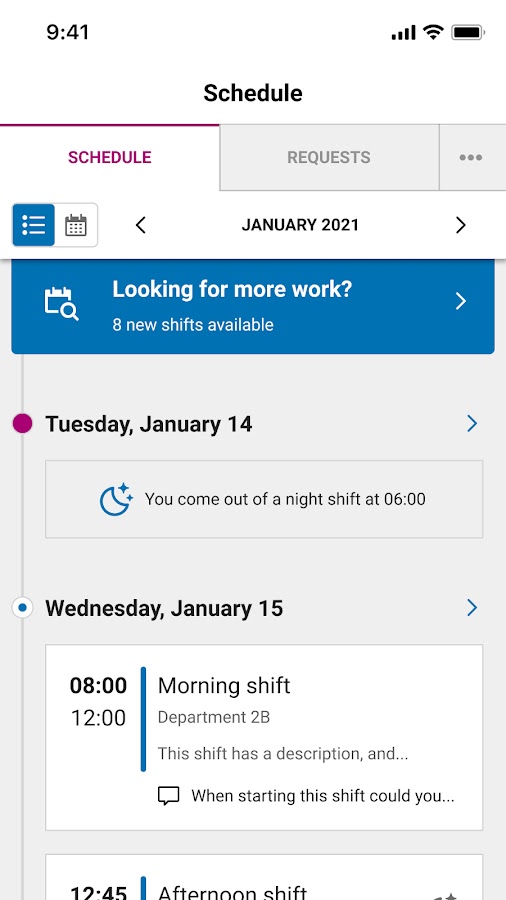 Поменять смену, запросить отпуск или выполнить дополнительную смену? Организуйте это легко и быстро сами в этом приложении. Всегда под рукой и удобен в использовании. За несколько секунд вы можете сами все составить в своем расписании.