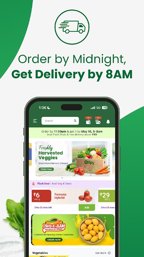 Первое и лучшее в Индии приложение для доставки свежих овощей и фруктов прямо с фермы за 12 часов.