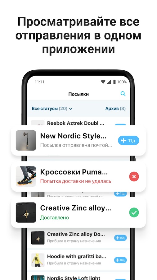 Бесплатное приложение Posylka.net — это отслеживание посылки по трекинг-коду и экономия времени ожидания доставки товаров из Китая с Aliexpress (АлиЭкспресс) или России и других доставок. Отслеживание можно производить по трекинг-коду заказов из таких магазинов как Beru, eBay, Amazon, Wildberries, Wish, Joom, Asos, Etsy и других.
