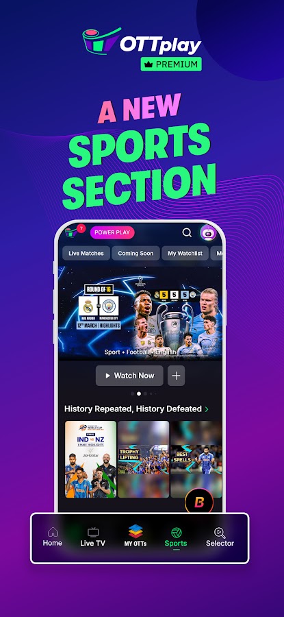 Получите доступ к прямым трансляциям спортивных событий на множестве партнерских OTT-платформ, таких как SonyLIV и Fancode, включая крикет, футбол, бадминтон, кабадди, теннис, единоборства и многое другое (контент зависит от пакета). Смотрите прямые матчи, турниры, лиги, лучшие моменты, экспертный анализ и эксклюзивные спортивные шоу — все в одном приложении. С OTTplay вы никогда не пропустите ни одного события, будь то Английская Премьер-лига, Индийская Премьер-лига, Ла Лига или глобальные турниры, такие как Чемпионат мира по крикету.