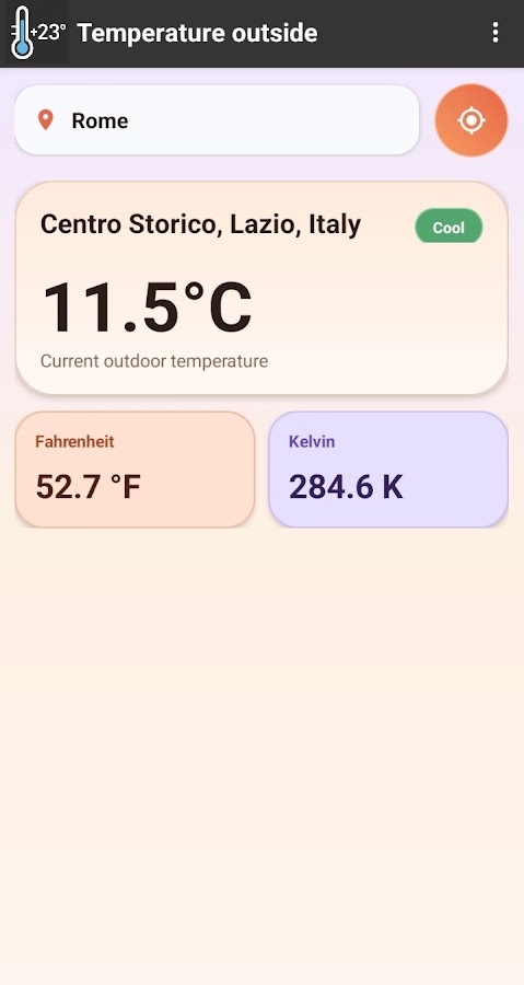 Это простое и быстрое погодное приложение позволяет сразу узнать температуру воздуха в вашем районе. Найдите город или используйте текущее местоположение, чтобы увидеть локальную температуру в понятном и удобном формате.