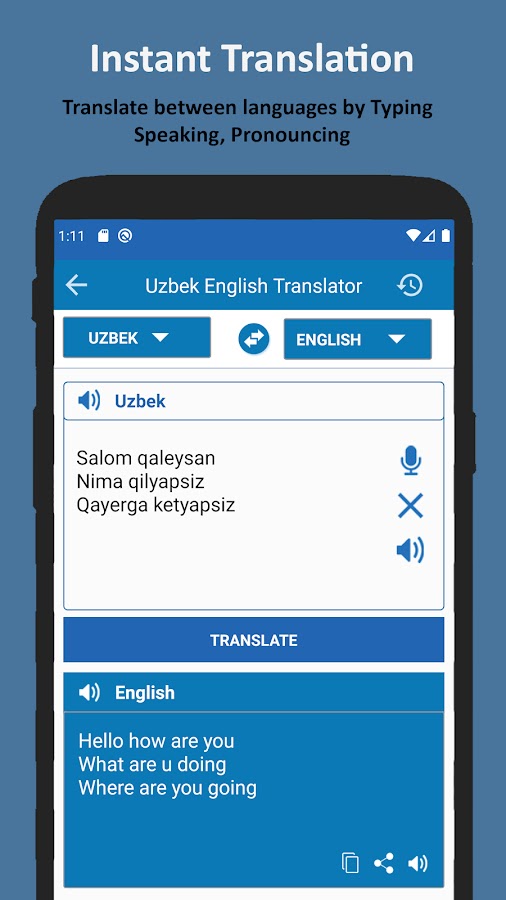 Inglizcha O’zbekcha Translate o’quv qo’llanmasi hech qanday institutga bormasdan, o’zbek-ingliz suhbatini uyda o’rganishni istaganlar uchun mo’ljallangan. Agar siz o’zbekcha inglizcha tarjimonni uyda o’rganishni istasangiz, u holda o’zbekcha-inglizcha tarjimonni yuklab oling.