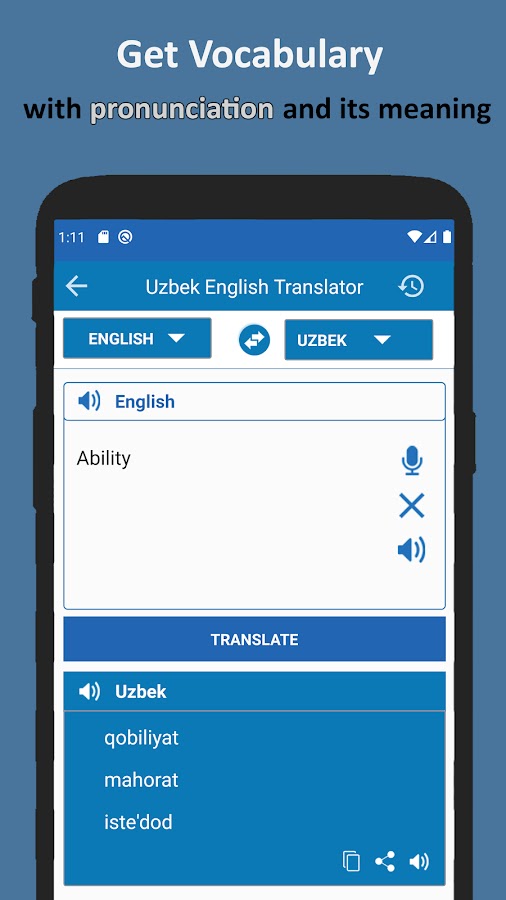 English to Uzbek AI Voice Translator comes with a dictionary to find the meaning of any word in detail. Now you can easily learn to speak with the English to Uzbek AI Voice Translator app. English to Uzbek AI Voice Translator allows you to easily copy, share, and use pronunciation tools to find the way to speak the words.