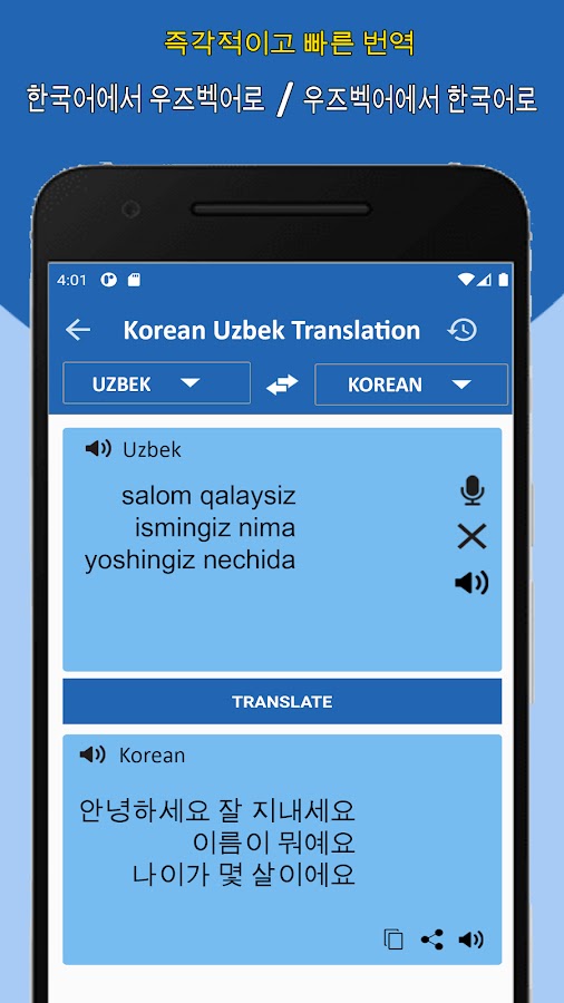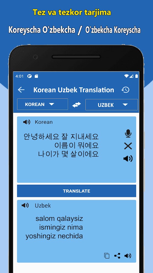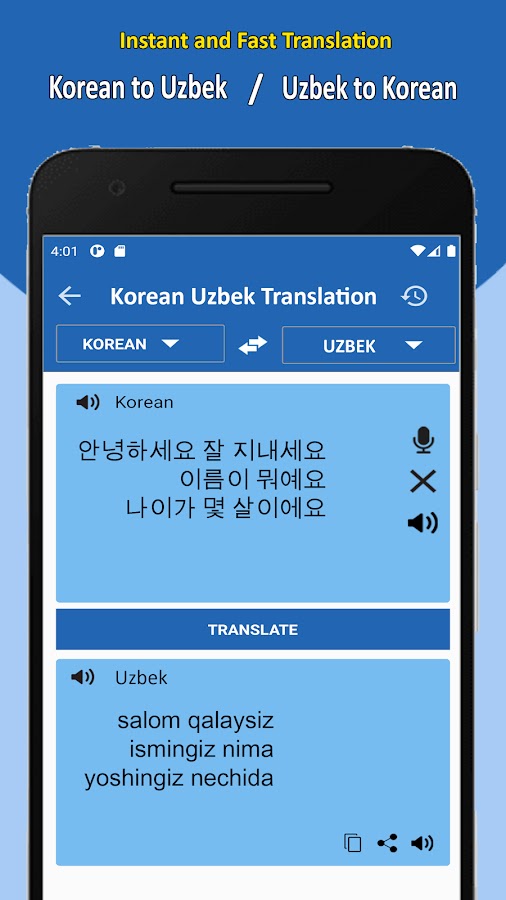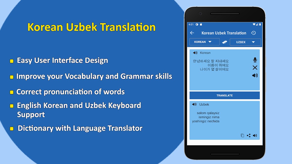 Корейско-узбекский словарь — лучшее приложение для Android для быстрого и лёгкого перевода, которое можно использовать как обычный словарь. Он переводит слова и предложения и станет отличным помощником в изучении языка.