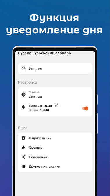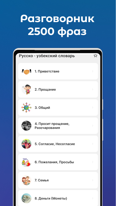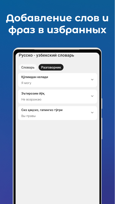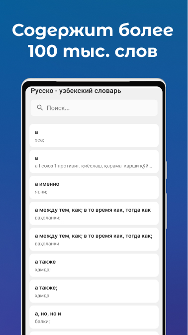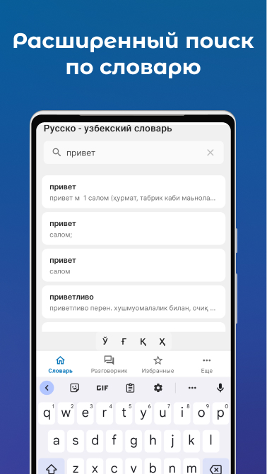 Есть функция поиск, чтобы быстро найти нужное вам слово сразу на двух языках. Вам не обязательно выбрать русско-узбекский или узбекско — русский. Введите слова в поиске и на русском языке и на узбекском языке.