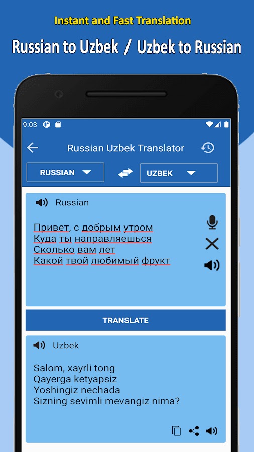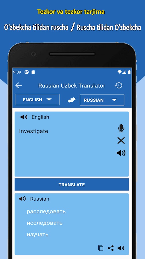Russian Uzbek Translation app is very easy and convenient to use for students, adults and for people who work in offices where they required to use Russian to Uzbek language on daily basis.