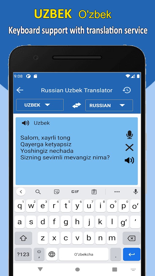 Русский узбекский перевод Клавиатура также может работать как русско-узбекская клавиатура. Например, если пользователь хочет написать русское слово или предложения, пользователю не нужно менять клавиатуру, ему просто нужно скопировать эти слова из приложения-переводчика и вставить туда, где он хочет.