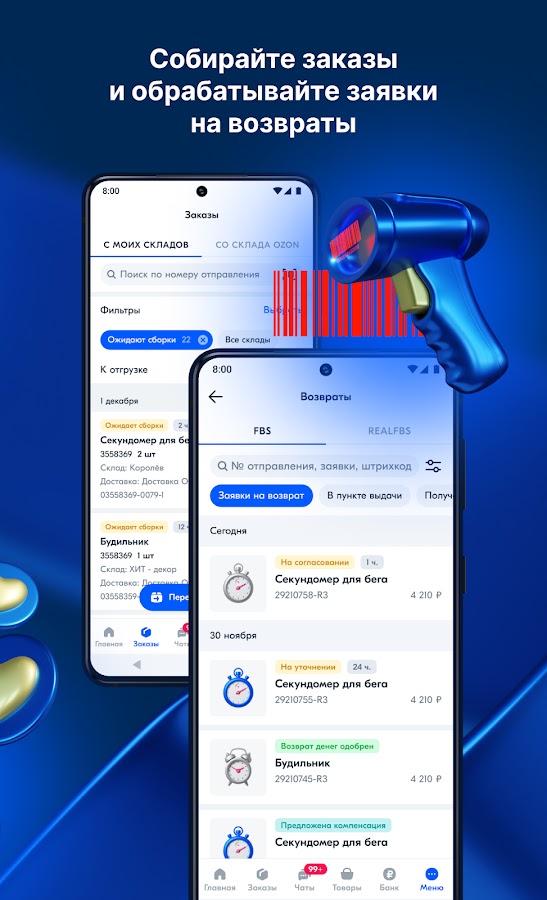 — следите за статусами возвратов и забирайте их по штрихкоду;