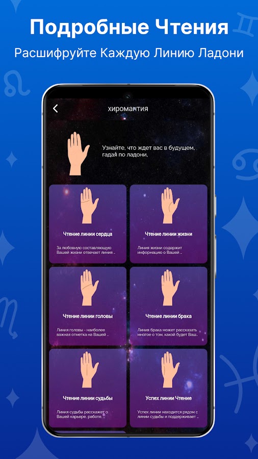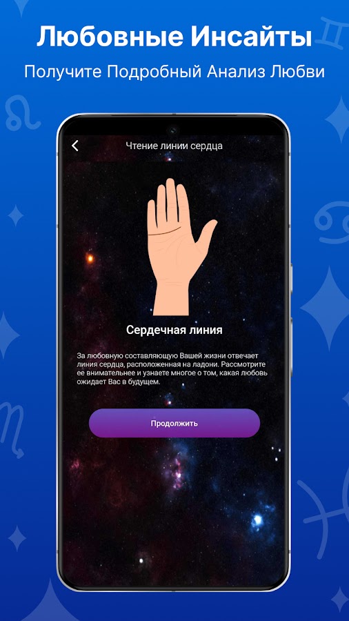 Хиромантия поможет Вам узнать не только свою собственную судьбу, но и секреты о Вас и Ваших друзьях, о которых Вы даже не догадывались. Внимательно рассмотрите линию жизни, головы, сердца и брака. Узнайте больше о том, что Вас ждет на любовном фронте, каким будет качество Вашей жизни, здоровье, личность, супружеская жизнь и многое другое. Веселое приложение, которое, к тому же, совершенно бесплатно. Лучше всего использовать в компании друзей.