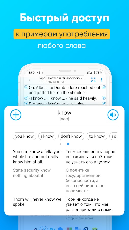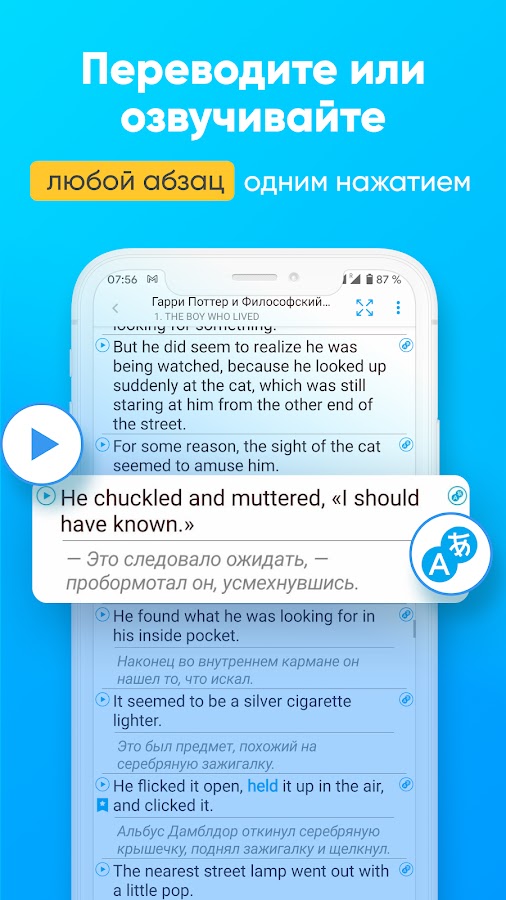 Функция голосового воспроизведения облегчит изучение и поможет улучшить произношение. Приложение позволяет превратить любой текст в аудиокнигу. Вы можете прослушать любую книгу с параллельным переводом.