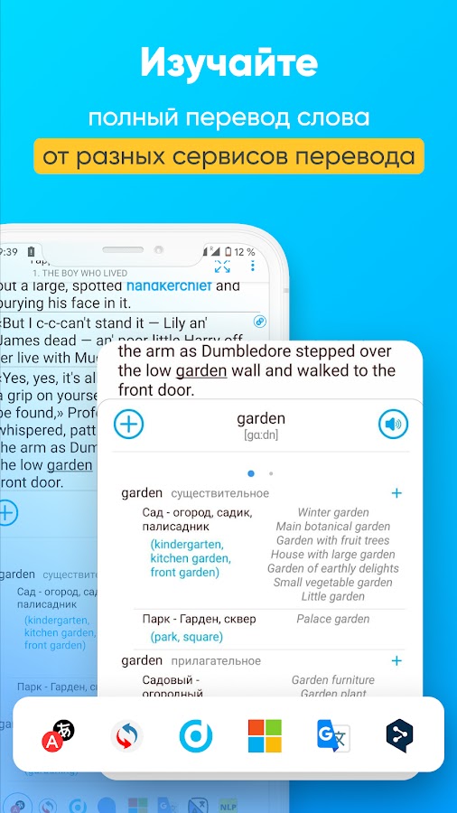Языковой обмен без проблем — удобный перевод длинным или двойным нажатием. Вы сами выбираете переводчик, который вам нравится и легко изучаете английский чтением.