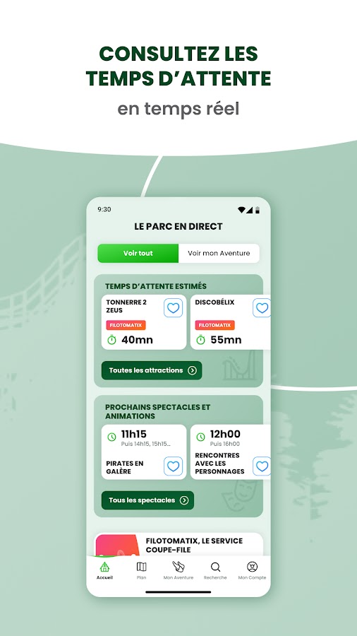 — Проверьте время ожидания ваших любимых аттракционов и расписание следующих шоу, чтобы оптимизировать свое посещение;