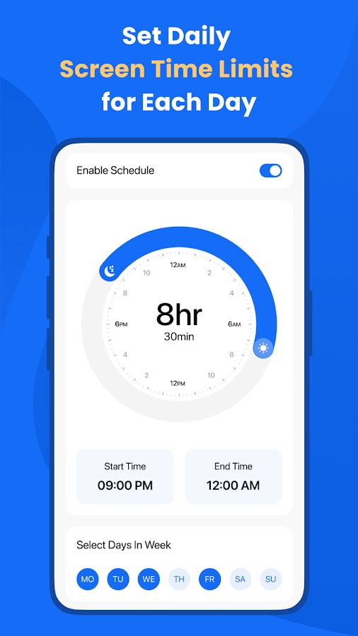 Ежедневные ограничения приложений. Приложения/игры будут заблокированы, как только будет достигнут дневной лимит времени. Вы также можете установить индивидуальный лимит приложения.